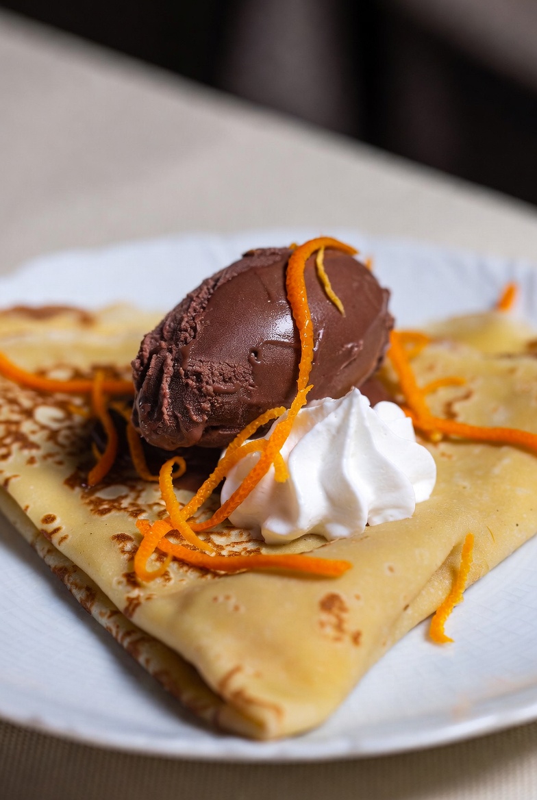 cogemos un crepe lo ponemos en un plato hacemos 2 bolas de gelato Bindi al cioccolato,  cortamos la naranja a trozos y derretimos el chocolate en un cazo al baño maría, y lo añadimos en el plato junto con la nata montada y listo para endulzarnos el día
