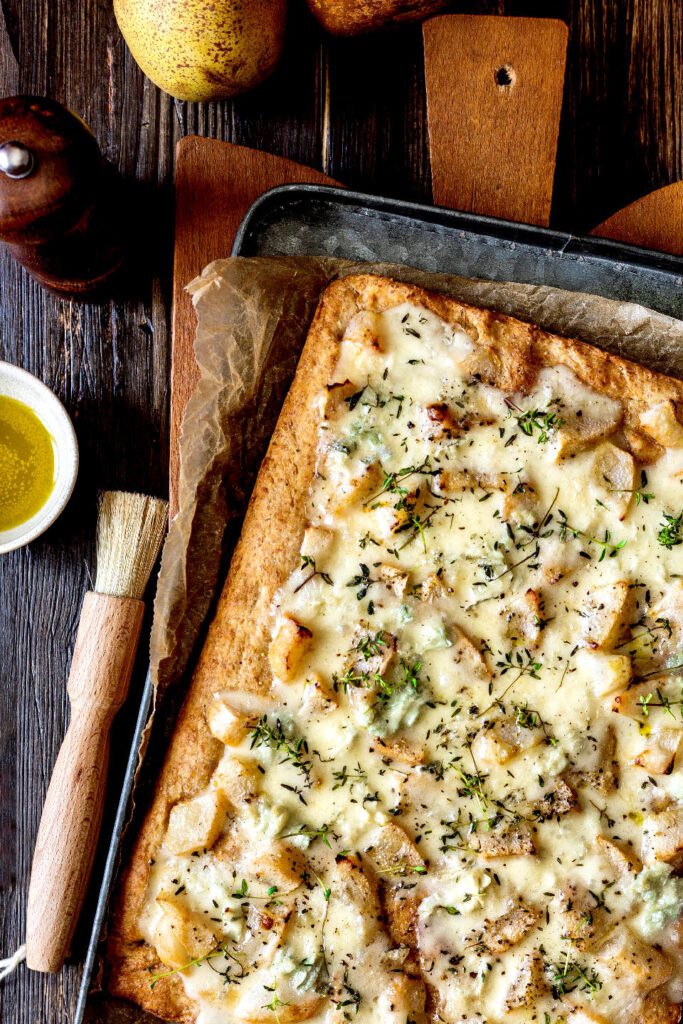 Focaccia al Olio Bindi con Gorgonzola Dolce, Pera y Nueces Tostadas