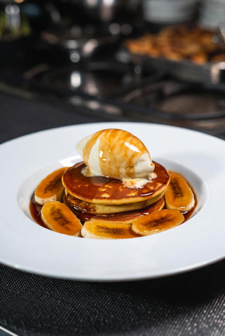 cogeremos un plato que nos guste ponemos 3 pancakes Bindi, 2 bolas de gelato al cioccolato, y añadimos el plátano a trocitos y bañamos con la  reducción que nos a quedado, nadie se puede resistir…..