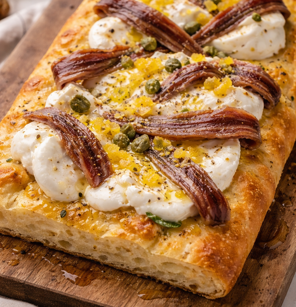 Focaccia al Olio Bindi con Burrata, Anchoas del Cantábrico y Limón Confitado