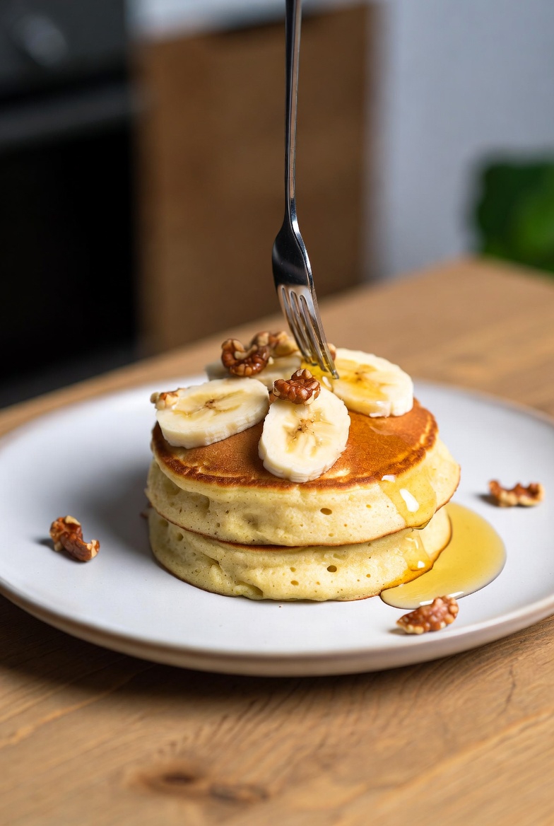 Pancakes con Plátano, Nueces y Miel Ingredientes (para 2 personas) 4 pancakes ya preparados1 plátano maduro pero firme30 g de nueces peladas2–3 cucharadas de mielUn poco de mantequilla para calentar los pancakes (opcional)Canela en polvo (opcional) Preparación paso a paso 1. Preparar los ingredientesPelar el plátano y cortarlo en rodajas finas.Trocear ligeramente las nueces