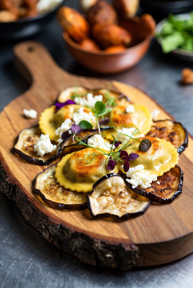 Ravioli con Nduja, Berenjenas Tostadas y Stracciatella de Burrata